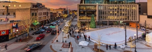 Flexibility was a key design principal. Moveable seating, dining areas, outdoor game tables allow visitors to choose from a variety of activities. An area was created for festivals such as the farmers’ market throughout the summer. Fire pits, warming huts, ice skate rental, mechanical equipment for the ice rink, and a Christmas tree are all incorporated into the space for wintertime programming.