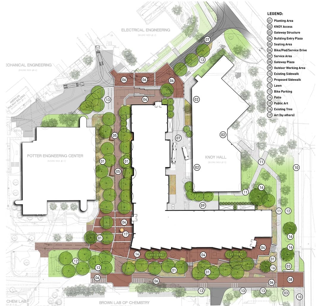 A new plaza forms outside the new Gateway Complex for the College of Engineering and the Purdue Polytechnic Institute. We are working with BSA Lifestructures as the prime architect for two new buildings that, along with the Nuclear Engineering Building and Michael Golden Laboratories, will constitute the overall Gateway Complex.